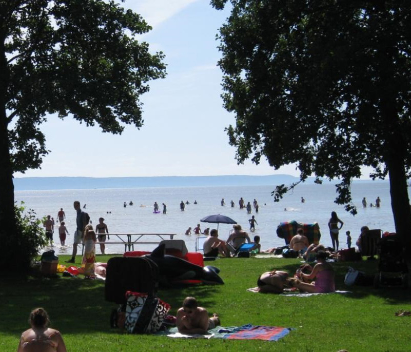 Badplats lite utanför Vargön. Badplatsen har kapacitet för fler än 200 badande per dag. Bryggor och pir finns. Badet är ett EU-bad. Sandstrand och ganska långgrunt. Småbarnsvänligt.