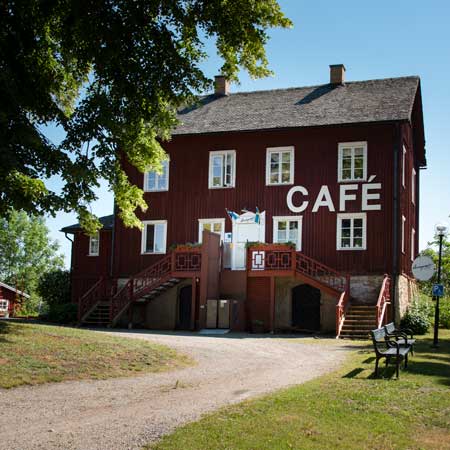 Här kan du sitta i caféet eller på glasverandan och njuta av en kopp kaffe. Under soliga dagar kan du blicka ut över sjön Spången från altanen/ uteserveringen som har en fantastisk utsikt! Dalslands fina Konstmuseum ligger